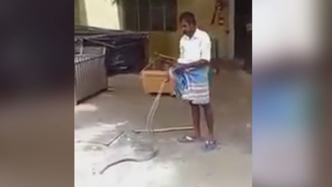 Dieser Mann fängt in der indischen Stadt Amalapuram eine Schlange - und zwar auf die wohl lässigste Art der Welt. Die umstehenden Passanten lachen begeistert, während er das wohl für keine große Sache hält.
