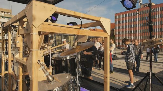 Ist das Musik, Kunst oder einfach nur krachender Lärm? Das müssen die Passanten am Neumarkt in Breslau entscheiden. Dort steht eine riesige Musikbox. Den Sound erkurbeln sich die Leute selbst.