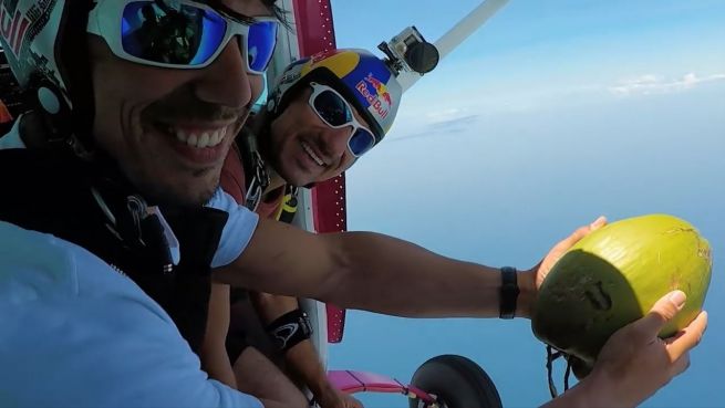 Die beiden Skydiver Frederic Fugen und Vincent Reffet haben reichlich Unsinn im Kopf. Neben gefährlichen Sprüngen kamen sie dieses mal auf die Idee, eine Kokosnuss mit in die Luft zu nehmen.