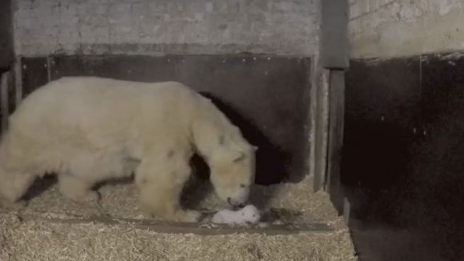 Das sieht noch ein bisschen unbeholfen aus, was dieses Eisbärbaby im Käfig veranstaltet. Wieder und wieder versucht es hochzukommen und aus eigener Kraft zu stehen. Ob das wohl gelingt?