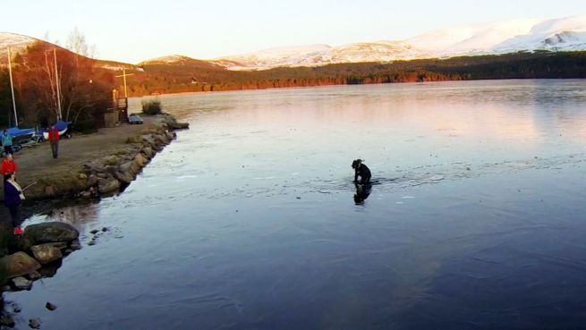 Loch Morlich in Schottland: Ein Hund hat sich auf den vereisten See hinausgewagt und kommt nicht mehr alleine an Land zurück, er droht zu ertrinken. Doch ein echter Held eilt dem Tier zu Hilfe.