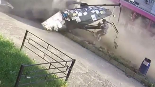 Ein Busfahrer in Russland verliert die Kontrolle über sein Fahrzeug und steuert mit voller Geschwindigkeit in eine Haltestelle. Eine ältere Dame stand auf dem Wartesteig und scheint anfangs begraben unter den Trümmern.