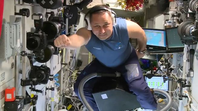 Anton Shkaplerov beweist bei einem Ritt auf dem ISS-eigenen Staubsauger, dass man auch im All immer für einen Spaß zu haben ist.