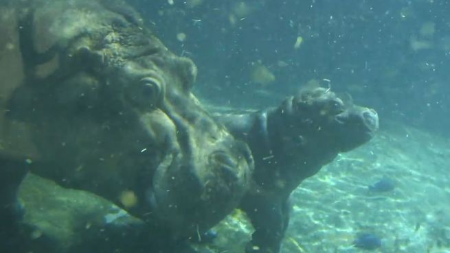 Die Nilpferd Dame Funani war am Donnerstag das erste Mal mit ihrem drei Wochen alten Baby im Wasser. Dort hat sie sich rührend um ihren Nachwuchs gekümmert.