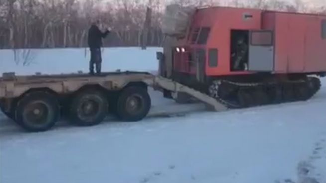 Vielleicht war es Übermut, vielleicht war Wodka im Spiel. Fest steht: Dank der Verladefähigkeiten der beiden Russen hat dieser Wohnwagen-Panzer seine besten Tage hinter sich.