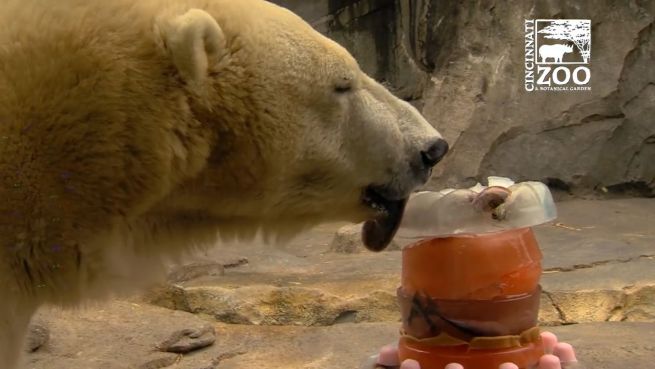 Im Cincinnati Zoo in Ohio feiern gleich zwei Polarbären Geburtstag. 'Little One' wird 28 Jahre alt, Eisbär-Dame 'Anana' 17. Und gefeiert wird ihr Ehrentag mit einer Eistorte, süß verpackt und super lecker.