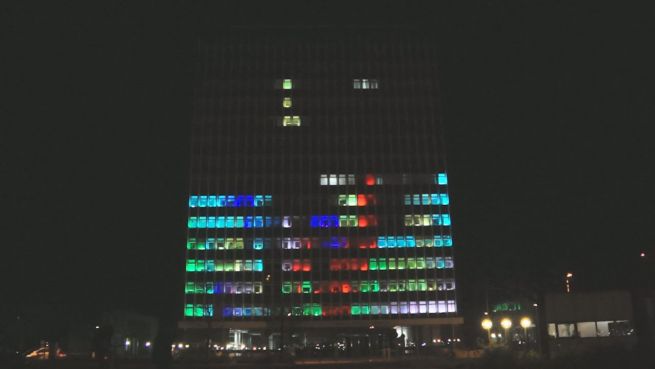 Auf dem Uni-Gebäude der Stadt Kiel kann man gerade Tetris spielen. Wer dabei an einen Video-Beamer denkt, liegt falsch. Studenten haben mit LED-Leuchten das gesamte Hochhaus in einen Bildschirm verwandelt.