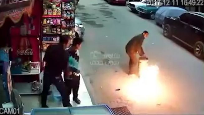Diese Männer leisten sich auf den Straßen Ägyptens einen erbitterten Kampf mit einer Gasflasche - und begehen so einige Fehler beim Umgang mit dem explosiven Feuerball.