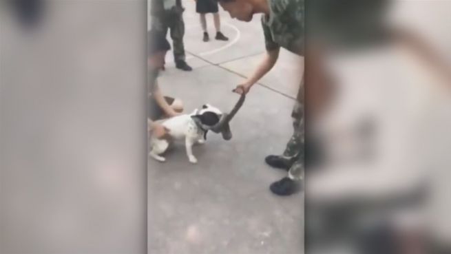 Ein Vierbeiner hat auf einem chinesischen Kasernenhof eine Schlange gefangen und ist so vernarrt, dass er das Tier einfach nicht mehr hergeben will. Mehrere Soldaten sind nicht in der Lage ihm die Schlange zu entreißen.