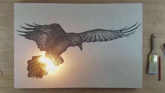 Danny Shervin hantiert schon seit seinem Studium mit Schießpulver. Jedoch schafft der Künstler etwas Schönes daraus. Mit einem Feuerzeug und viel Geduld bewaffnet enstehen seine sehr feurigen Werke.