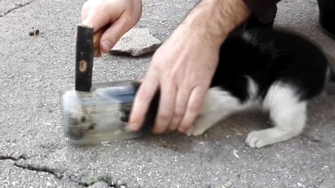 Diese Katze steckt mit ihrem Kopf in einem Glas fest. Doch zu ihrer Rettung eilen gleich ein paar Männer herbei. Ihr Befreiungs-Werkzeug: ein Hammer.