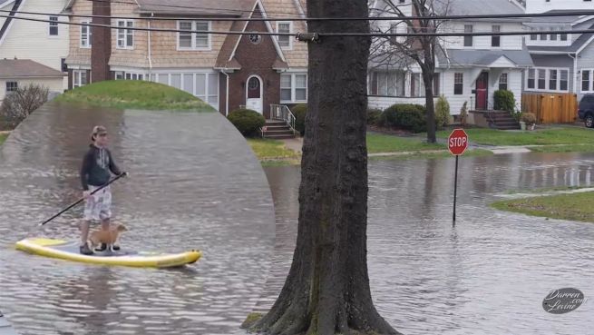 In Amerika herrscht immer noch ein völliges Wetterchaos. Nach heftigen Regenfällen hat Youtuber Darren Levine das tägliche Gassi gehen auf das Paddleboard verlagert - und dem Hund scheint es zu gefallen.