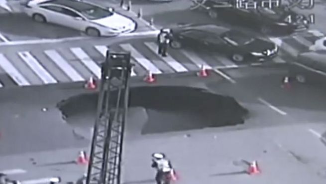 Eine Überwachungskamera hat diese unglaublichen Bilder eingefangen. Mitten auf einer viel befahrenen Straße in einer chinesischen Millionenstadt senkt sich an einer Stelle plötzlich der Asphalt ab.
