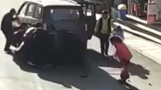 Der Fahrer eines Minivans hat den Jungen auf der Straße nicht gesehen, und fuhr einfach über ihn hinweg. Er bemerkte zwar gleich seinen Fehler und versuchte den Kleinen zu retten, doch erst mit Hilfe von Passanten gelang es ihm, sein Auto anzuheben.