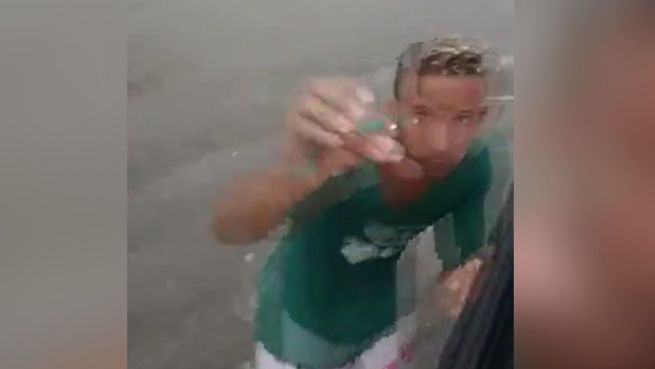 Ein Bus kämpft sich durch eine überflutete Straße. Solche Bilder will man natürlich festhalten. Ein dreister Dieb macht sich die Filmfreude einer Person zu nutze und versucht ihr das Handy zu entreißen.