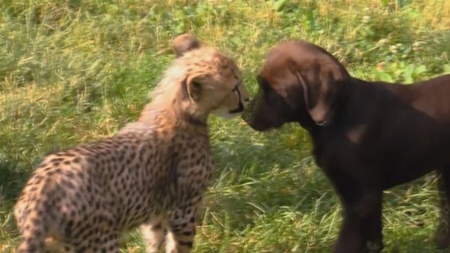 Diese zwei Freunde zeigen, dass Hunde und Katzen sich durchaus vertragen können. Das Geparden-Junge Donni und Hundewelpe Moose tollen im Zoo von Cincinnati herum - und haben ganz offensichtlich eine Menge Spaß.