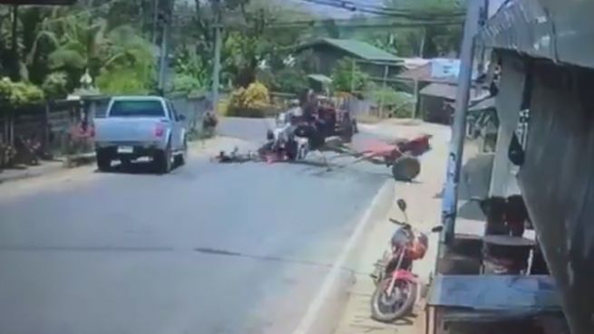In Thailand hat ein scharfes Ausweichmanöver für diesen kuriosen Unfall gesorgt. Zahlreiche Passagiere purzeln in einer Kurve von der Ladefläche eines Pickups - und tun danach so, als wäre nichts passiert.