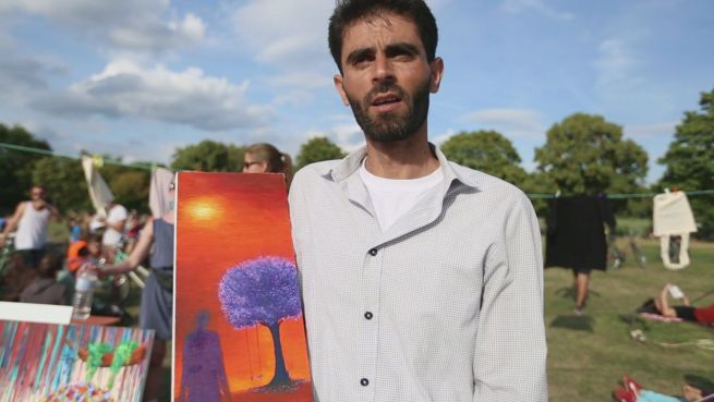 Mohammad stammt aus Syrien. Aktuell jedoch lebt er in einem umgebauten Hangar auf dem ehemaligen Flughafen Tempelhof in Berlin. Beim 'Willkommens-Picknick' gab der Maler seine Kunstfertigkeit an andere weiter.