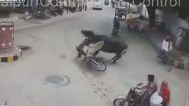 Dieses Video aus Pakistan zeigt einen heftigen Zusammenstoß zwischen einem Mopedfahrer und einem Bullen. Der Mann bleibt zunächst bewusstlos liegen, soll sich aber keine Verletzungen zugezogen haben.