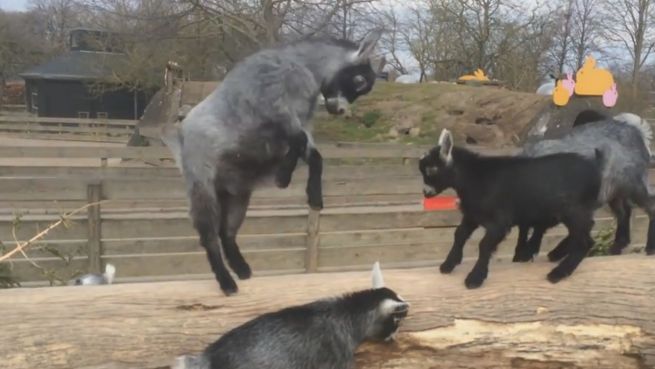 Rauflustig: Niedliche Baby-Ziegen kämpfen auf Baumstamm