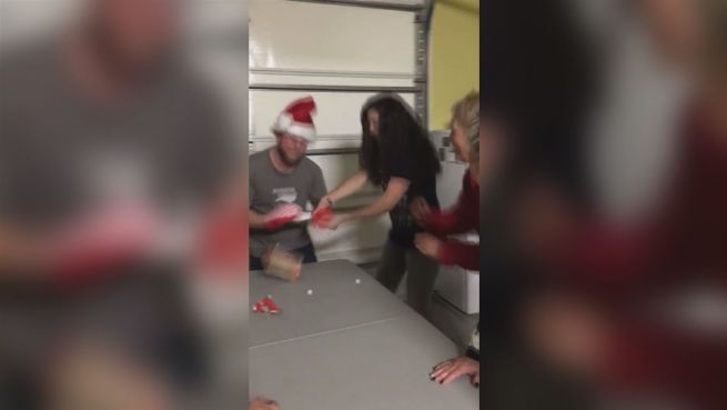Einfach nur Geschenke unterm Tannenbaum auspacken ist doch langweilig. Diese Gruppe macht es sich mit dem lustigen Würfelspiel zusätzlich schwer und kämpft um das begehrte Paket. Natürlich bleibt bei diesem Spaß kein Auge trocken.