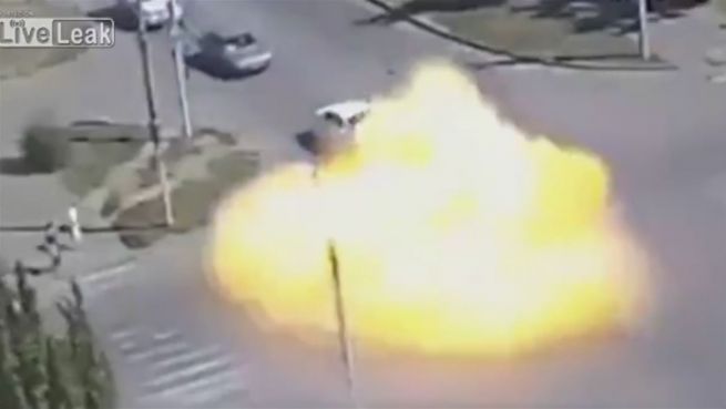 EIn Zusammenstoß mit verheerenden Folgen zeigt dieses Video einer Überwachungskamera. Auf einer Kreuzung explodiert der Tank eines Transporters, als er von einem PKW gerammt wird und hüllt alles in einen riesigen Feuerball.