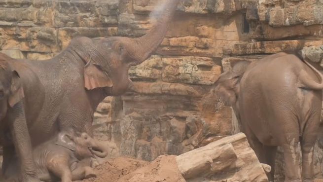 Im britischen Chester Zoo müssen auch die Tiere an heißen Sommertagen versorgt werden. So auch die Elefanten des Zoos und die haben sichtlich Spaß bei ihrer kalten Dusche.