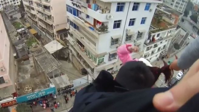 In der chinesischen Stadt 'Ankang' hat eine Frau versucht, sich vom Dach eines Wohnhauses zu stürzen. Aufnahmen der Bodycam der Polizei zeigen, wie ihr Ehemann versucht, die Frau an ihren Haaren festzuhalten.