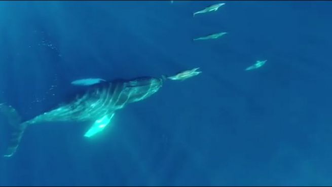 Sie trotzen dem Größenunterschied: Domenic Biagini konnte gleich mehrfach aufnehmen, wie Delphine und Buckelwale zusammen durch den Ozean gleiten. Es sind Bilder von atemberaubender Schönheit.