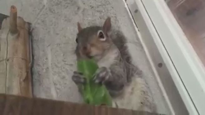 Süß: Grauhörnchen 'Squeaky' mümmelt Gemüse