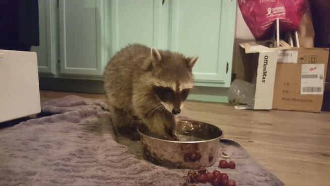 Haben Waschbären ihren Namen, weil sie so viel waschen? Ja und nein. Der Waschbär Rocket zumindest freut sich über ein paar Trauben und eine Schüssel Wasser.