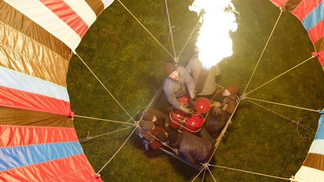 Mit einem selbstgebauten Ballon soll die Flucht aus der DDR gelingen. Der neue Thriller von Michael Herbig kommt am 27. September in die deutschen Kinos. Den Original-Ballon gab es gerade vor dem Reichstag zu sehen.