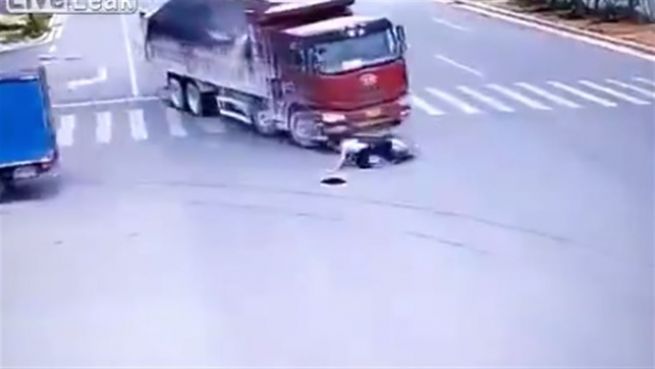 In der chinesischen Stadt Shangrao ereignete sich vor wenigen Tagen ein unglaublicher Unfall mitten auf einer Kreuzung. Ein Rollerfahrer wird gleich von zwei Lastwagen angefahren und überlebt fast unverletzt.