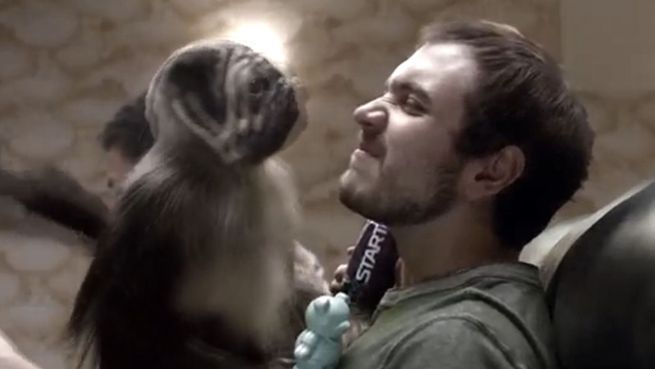 Verstörend: Bizarre Werbung mit Welpen-Affen-Baby