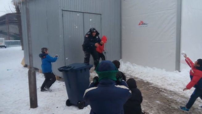 Ein Kontrollverlust der serbischen Polizei, der alle glücklich macht. Im Flüchtlingslager von Sid haben die Kinder zum Angriff geblasen. Sie decken einen Beamten mit dutzenden Schneebällen ein.