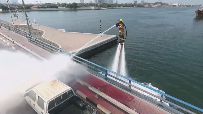 Dubai: Um dem ewigen Stau der arabischen Metropole zu entfliehen, kommen die Brandbekämpfer nun einfach übers Wasser gerast. Erst per Jetski, und dann, noch viel cooler, per Jet-Pack geht es an den Brandherd.
